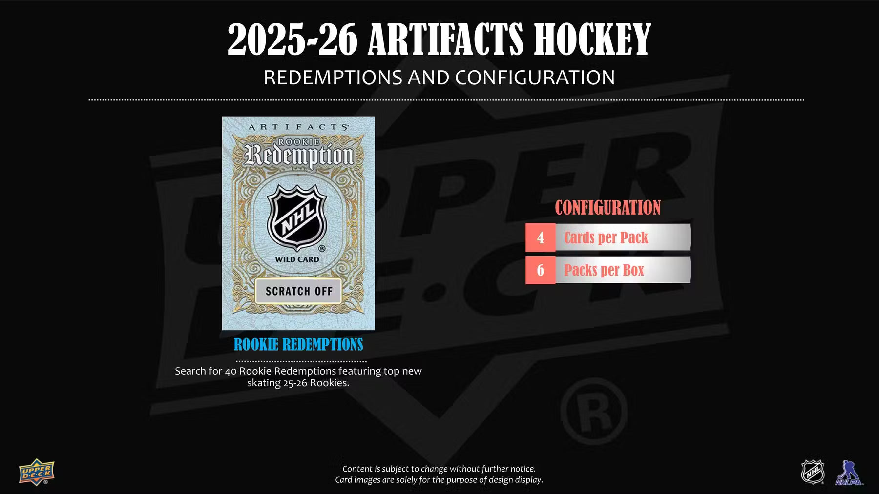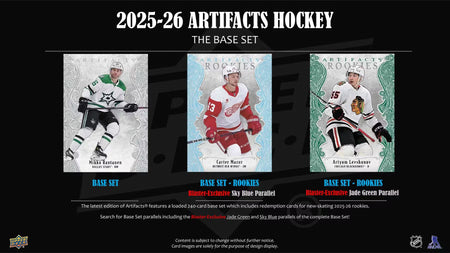 The latest edition of Artifacts features a loaded 240-card base set which includes redemption cards for new-skating 2025-26 rookies. Search for Base Set parallels including the Blaster-Exclusive Jade Green and Sky Blue parallels of the complete Base Set!