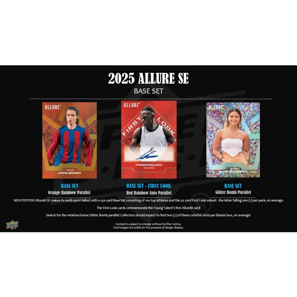 - NEW EDITION! Allure® SE makes its multi-sport debut with a 150-card Base Set consisting of 100 top athletes and the 50 card First Look subset - the latter falling one (1) per pack, on average. The First Look cards commemorate the Young Talent’s first Allure® card! Search for the retail-exclusive Glitter Bomb parallel! Collectors should expect to find two (2) of these colorful cards per blaster box, on average!