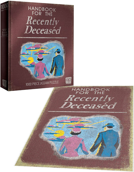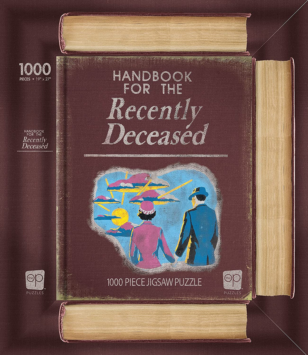 - Greetings from the other side - this collectible jigsaw puzzle features stylized artwork of the Handbook for the Recently Deceased from the classic 1988 Tim Burton film Beetlejuice