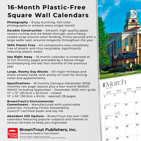 Now 100% free of plastic and completely recyclable, this newly re-designed square wall calendar is an even better way to bring stunning photos and graphic art into your home, or as a gift for your favorite person. The new and improved 12" x 12" calendar is bound in a distinctive wrap-around cover made of an even heavier-duty stock paper than before. This protective packaging surpasses plastic wrap while being far friendlier to the planet. All of this opens to a tall, 24-inch calendar to grace your wall with the best images of your favorite passion. Dated January to December, it also includes a bonus, four-month mini calendar page of September to December of the previous year to give you a jump start on planning. Monthly grids allow ample space for writing daily tasks and appointments, and includes all major U.S. and worldwide holidays. You can purchase with the reassurance that all components are recyclable.