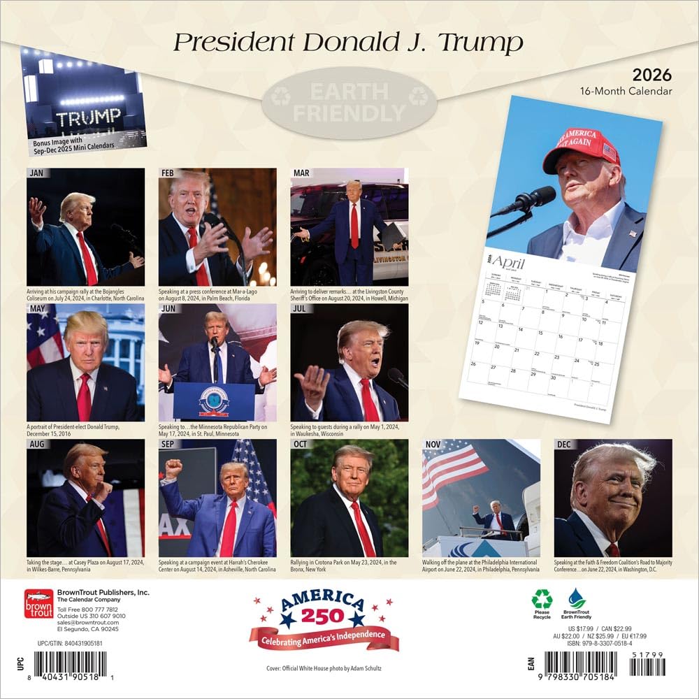 Browntrout: President Donald J. Trump: 2026 12 x 24 Inch (Hanging) Monthly Square Wall Calendar