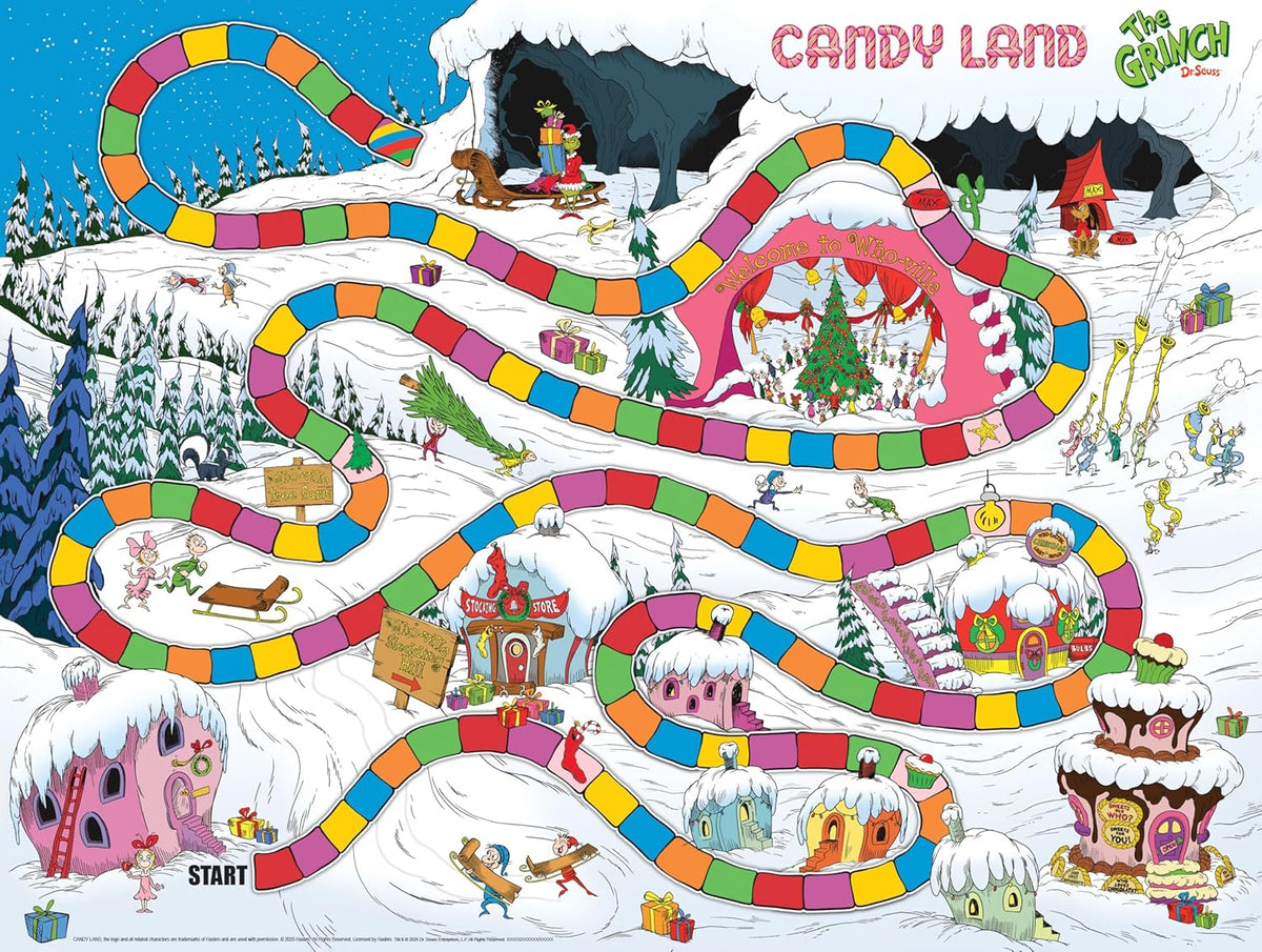 - Race through Who-ville! Journey past Cindy-Lou Who’s home, Max’s Doghouse & twinkly Holiday Light Path to reach Mt. Crumpit in this festive Grinch-themed Candy Land game!