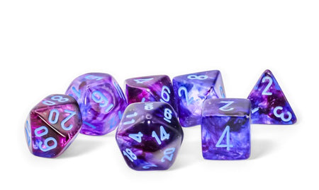 Contains 7 Nebula Nocturnal Dice with blue numbers in the following Shapes:
