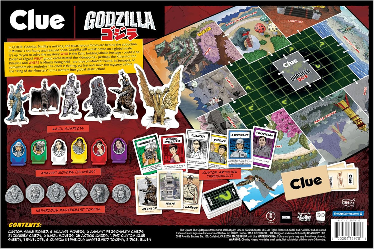 In CLUE: Godzilla, Minilla is missing, and treacherous forces are behind the abduction. If Minilla is not found and rescued soon, Godzilla will wreak havoc on a global scale. It’s up to you to solve the mystery: WHO is the Kaiju holding Minilla hostage - could it be Rodan or Gigan? WHAT group orchestrated the kidnapping - perhaps the Xiliens or the Kilaaks? And WHERE is Minilla being held - are they on Monster Island, in Seatopia, or somewhere else entirely? The clock is ticking, act fast and solve the mystery before the “King of the Monsters” turns matters into global destruction!