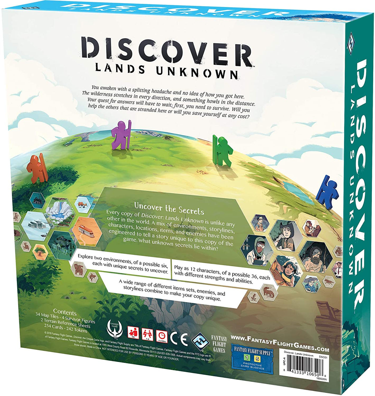 Fantasy Flight Games is proud to present Discover: Lands Unknown, a game of survival and exploration! When two to four players find themselves marooned in the harsh wilderness, you must cooperate and compete to search for water, food, and tools that will be essential to your very survival. But your adventure holds many secrets. Every copy of Discover: Lands Unknown is unlike any other in the world. A mix of environments, storylines, characters, locations, items, and enemies have been engineered to tell a story unique to every copy of the game thanks to an algorithm that ensures no two copies are alike. Your copy will contain a variety of tiles, cards, and tokens, each pulled from a shared pool of components, and the combination will be different from every other copy in the world.