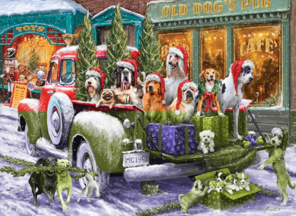 Celebrate the magic of Christmas with the Puppy Presents 1000-Piece Puzzle by Eurographics, featuring the heartwarming artwork of Marcello Corti! This festive puzzle captures an adorable holiday scene where a cheerful group of puppies, dressed in Santa hats, ride along in a classic red truck. Surrounded by snow, Christmas trees, and brightly wrapped presents, these playful pups are ready to bring holiday cheer to everyone they meet. The quaint background of a snow-covered village adds a nostalgic charm to this delightful winter wonderland.