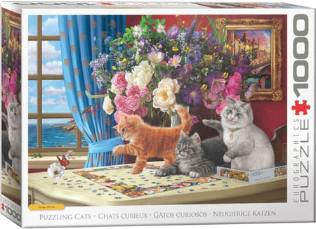 Unleash your inner puzzler with the delightful Puzzling Cats 1000-Piece Puzzle by Eurographics, featuring the whimsical artwork of Image World! This playful puzzle brings together an irresistible combination of curious kittens and a picturesque room filled with vibrant flowers, rich drapery, and a serene seaside view. Watch as the mischievous kittens interact with the puzzle pieces, adding a charming touch of feline fun to your puzzle-solving experience.