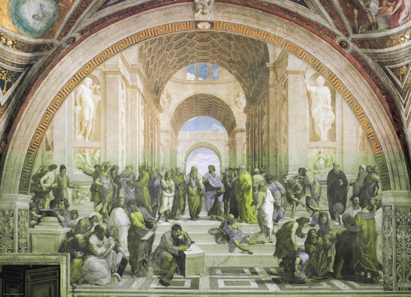 - Raphael's masterpiece features the most famous philosophers of ancient times moving within an imposing Renaissance architecture. The list includes none other than Aristotle, Plato, Socrates, Pythagoras, Heracleitus, Diogenes and Ptolemy to name a few.