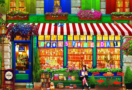 Step into the charm of a timeless literary haven with The Old Bookstore, a 2000-piece Oversize puzzle from Eurographics' Big Puzzle Collection. This stunning image captures the warmth and nostalgia of a quaint bookshop filled with colorful books, vibrant flowers, and inviting seating.