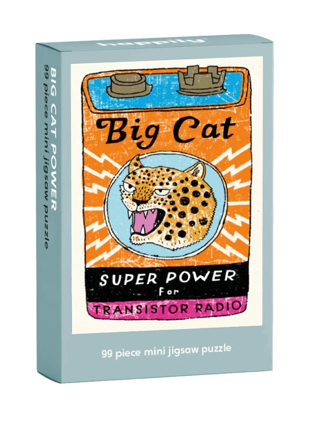 This 99 Piece Mini Jigsaw Puzzle features a fun cat-themed illustration by Charlotte Farmer. "Big Cat Power" is the quintessential gift for cat lovers and avid puzzlers alike!