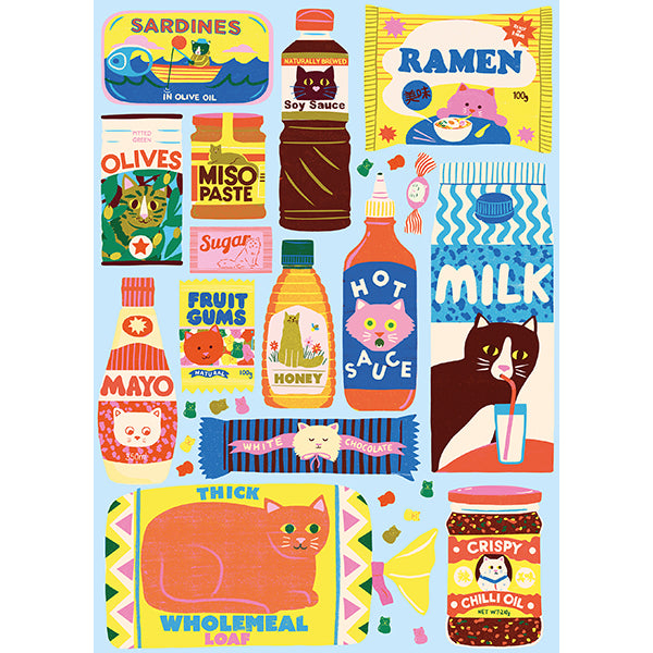 Enjoy this 1000-piece puzzle of fun cat food illustrations by Naomi Wilkinson! As you assemble "Cat Food" you'll find yourself smiling--just keep it away from the cat!