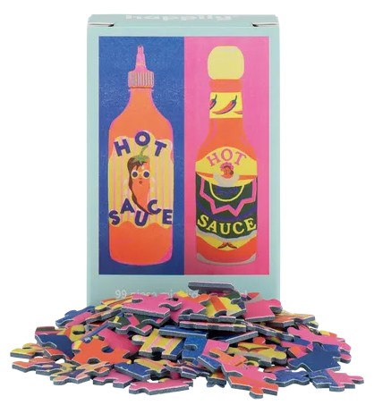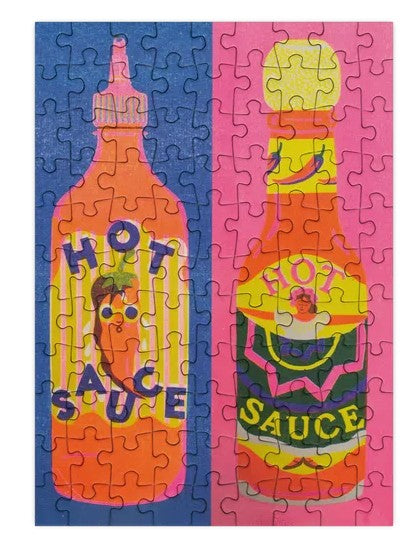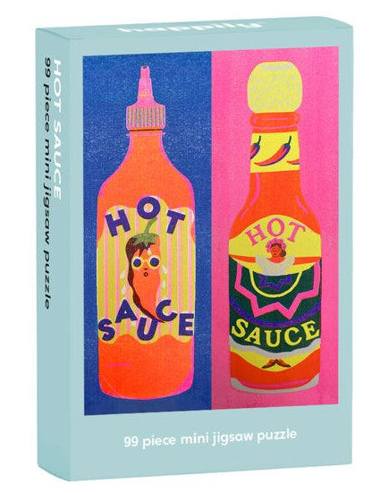 This 99 Piece Mini Jigsaw Puzzle features a hot sauce bottle duo by Naomi Wilkinson.
