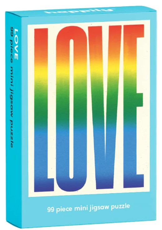 This 99 Piece Mini Jigsaw Puzzle features a gradient illustration of the word 'Love' by Walker Carney.