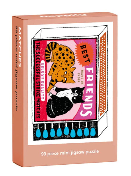 This 99 Piece Mini Jigsaw Puzzle features a fun illustration of a match box by Charlotte Farmer. "Matches" is the quintessential gift for cat lovers and avid puzzlers alike!