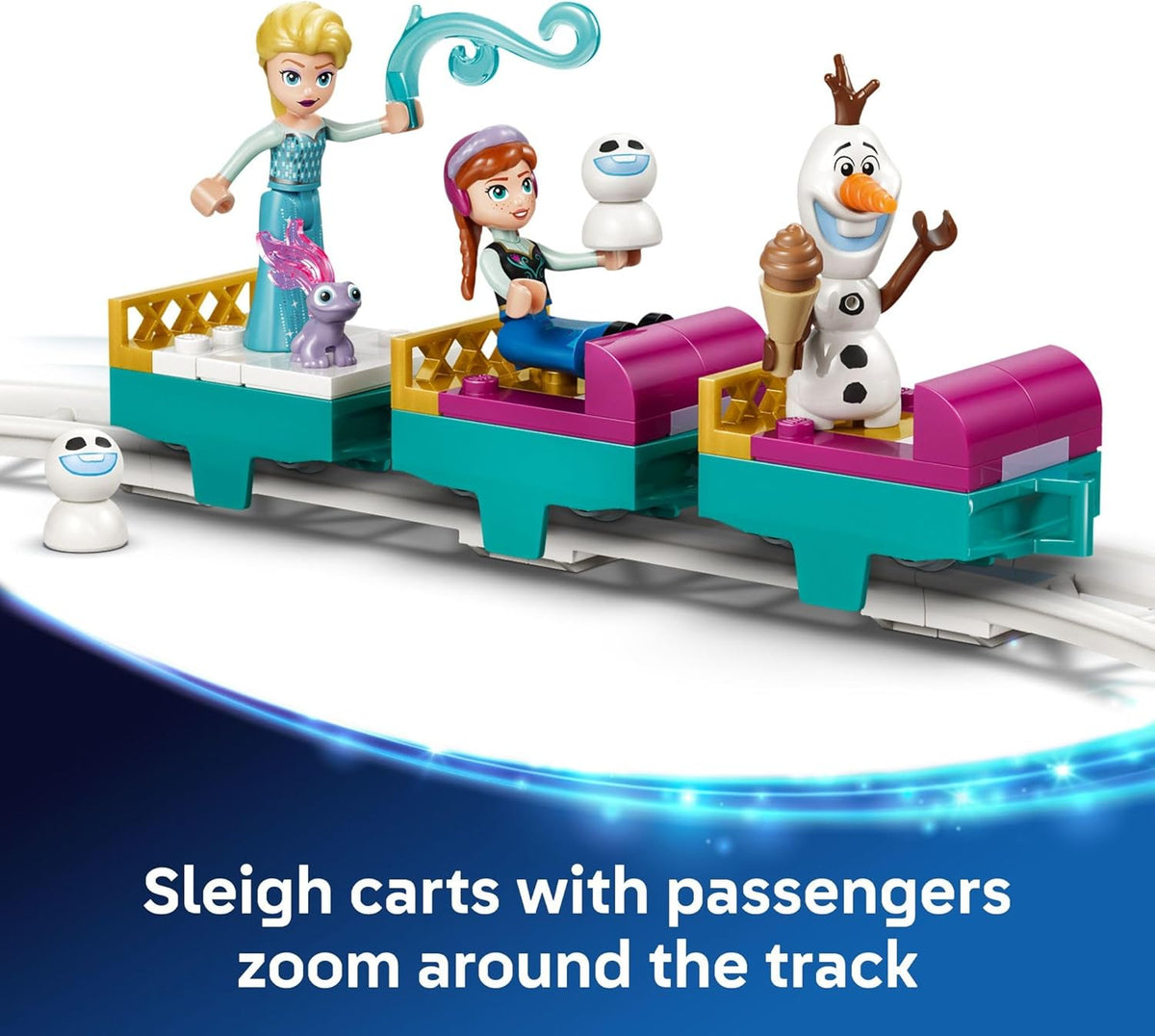 - SLIDING SLEIGH RIDE – A separate track with a staircase and 3 sleigh carts lets kids send the characters on a thrilling ride, adding exciting action to their Frozen adventures