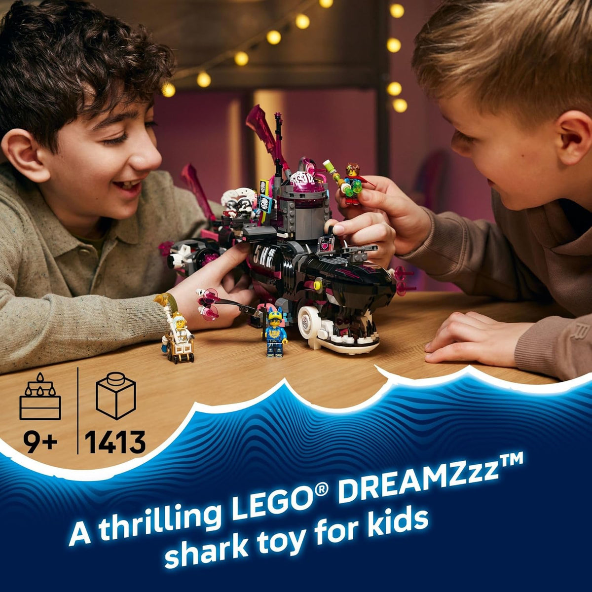 - INTERACTIVE FEATURES & DETAILS – Kids can launch detachable aircraft and fire missiles from the shark's mouth, while modular boosters let kids mix up their build and connect with other building sets in the LEGO DREAMZzz 2025 collection (each set sold separately)