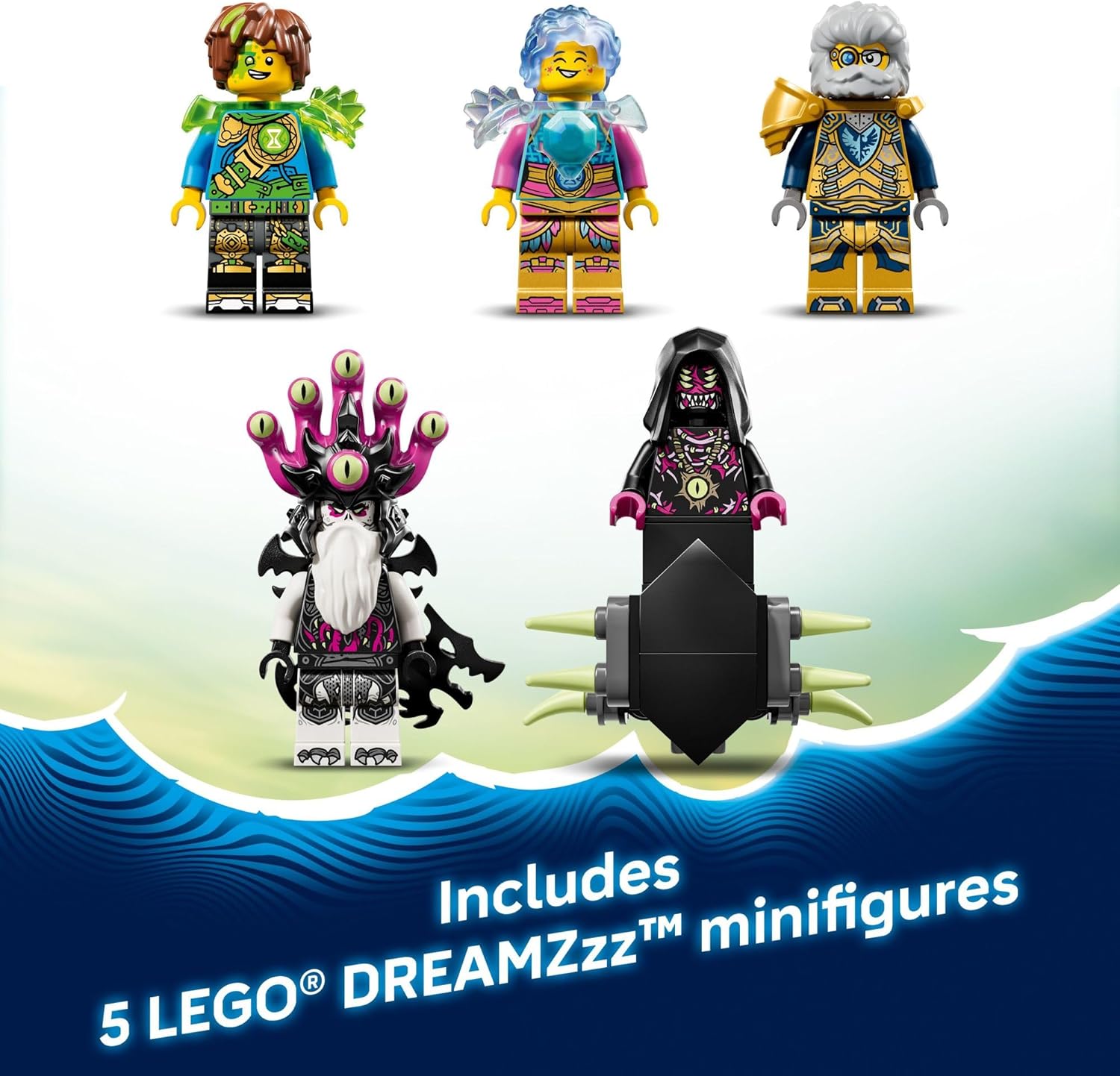 - LEGO DREAMZZZ MINIFIGURES – Includes Mateo, Izzie, Mr. Oz, the Nightmare Emperor and Arika minifigures plus Z-Blob, a Grimspawn, 3 spiders, 2 dreamling figures and Green and White Treasure Creature figures