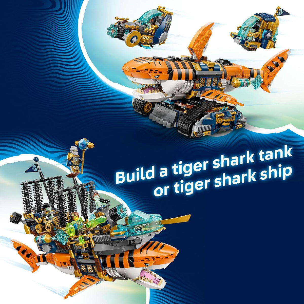 - 2 WAYS TO BUILD – Kids can create a tiger shark tank with an opening mouth and movable tail or a tiger shark ship with a front cannon and treasure storage in the back