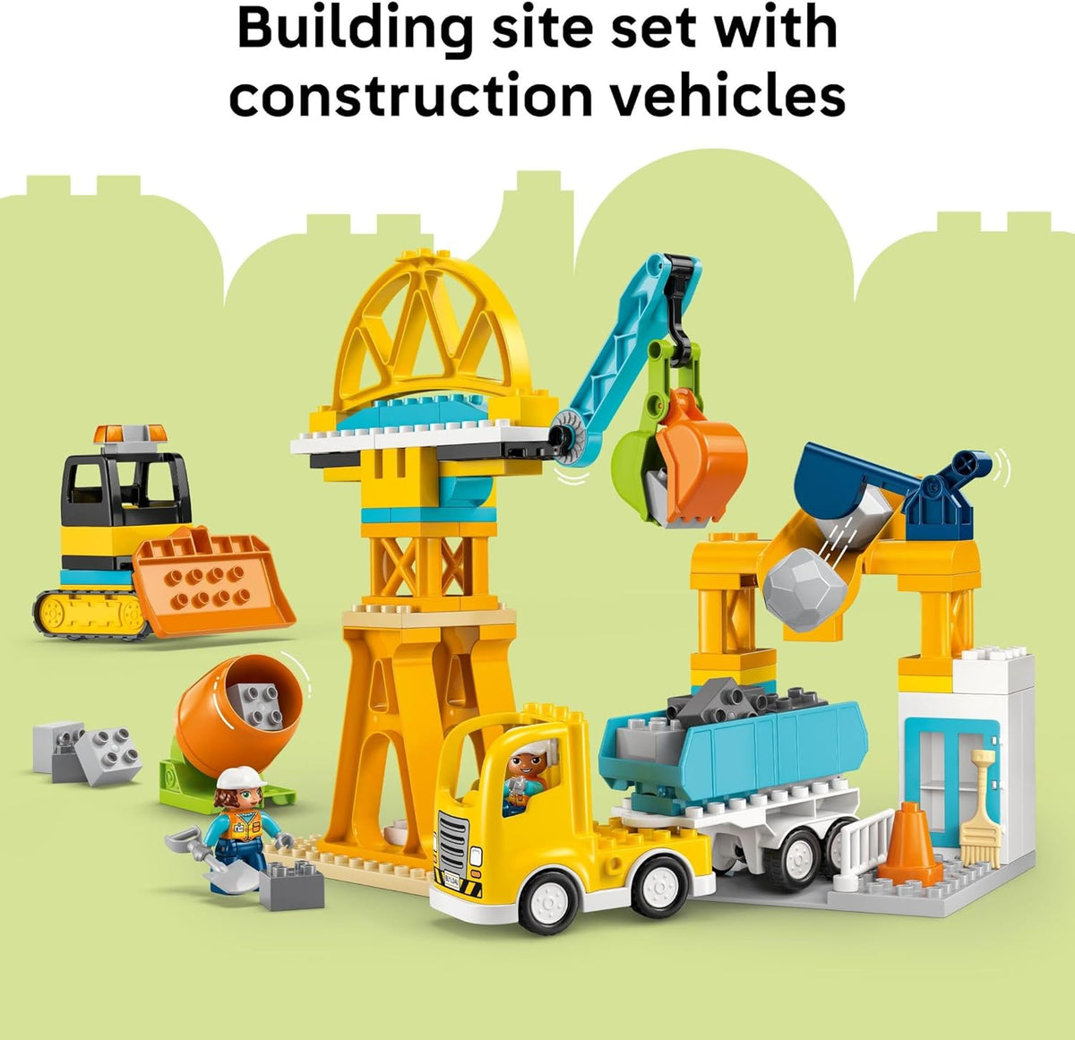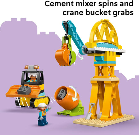 Introduce future engineers to nonstop building action with the LEGO DUPLO Town 3 in 1 Construction Site and Vehicles (10476) pretend play toy for toddler boys and girls ages 3 years old and up. Little ones immerse themselves in busy construction play as they build a bulldozer with a lifting bucket, a dump truck with a tipping action, a cement mixer with a rotating drum, and a crane with a movable arm and hinged bucket. The bricks also assemble to make a tall crane, a loading station the trucks can rumble through, and a bridge the vehicles can drive under.