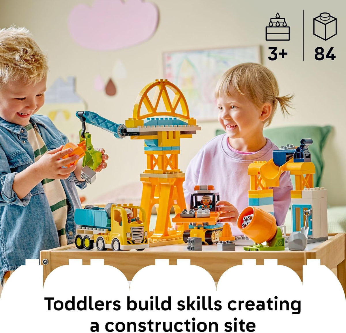 Toddlers practice fine motor skills as they load and unload the trucks and move boulders and bricks, develop critical thinking as they work out how to construct the buildings, and build spatial awareness as they help their 2 worker figures use the trucks' features to move materials around the building site. Makes a thoughtful birthday or special occasion gift for little ones who love construction trucks and building site play. Contains 84 pieces.