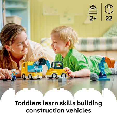 Toddlers practice creativity, problem-solving, perseverance and fine motor skills as they experiment with different solutions to make inventive construction vehicles. Two builder figures are included so young children can use them to drive and operate the vehicles. LEGO DUPLO Town sets help toddlers make sense of the world as they build, explore and role-play familiar scenes. Makes a thoughtful birthday or special occasion gift for little ones who love construction trucks and vehicle play. Contains 22 pieces.
