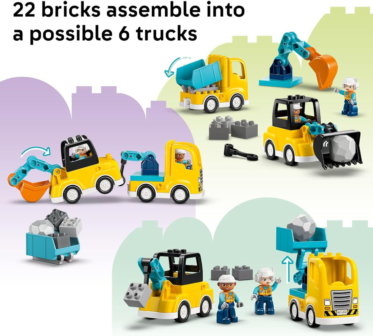 Rev up creativity with the LEGO DUPLO Town 3 in 1 Construction Vehicles (10475) building toy for toddler boys and girls ages 2 years old and up. Young builders enjoy endless rebuilding fun as they use their focus to create 6 different construction truck toys. This LEGO DUPLO construction toy's 22 bricks make 3 pairs of trucks: a loader with a tipping bucket that fills the dump truck with bricks, a digger and a tow truck with a rotating arm, or a scissor lift and a second tow truck with a smaller hook for lifting bricks.