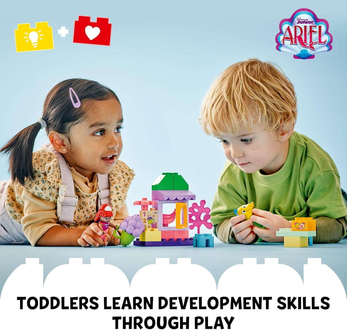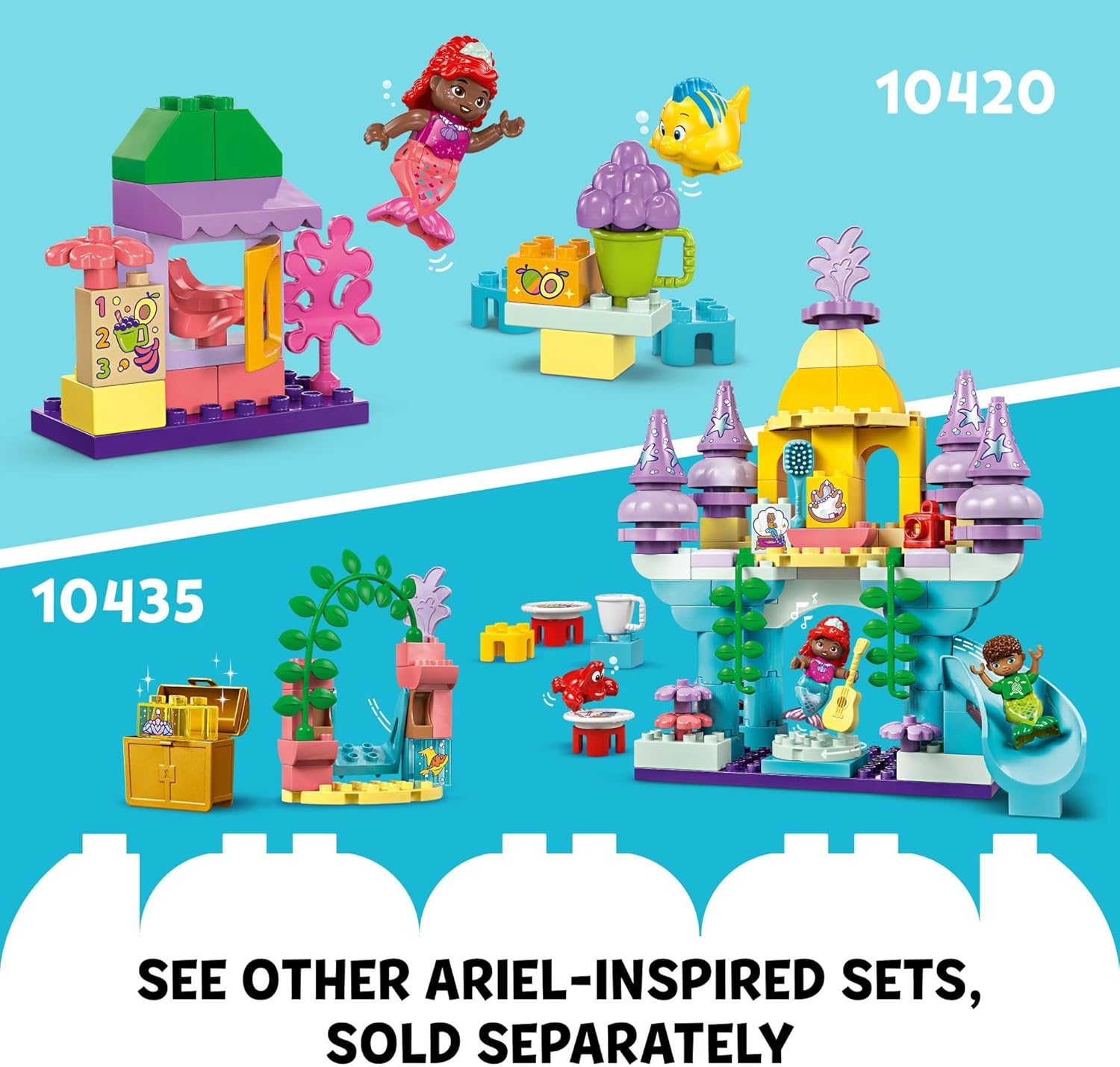 - Construction toy for Little Mermaid fans ages 2 and up – LEGO DUPLO Disney Ariel and Flounder’s Café Stand building toy with fruit elements and kids play food for toddlers.