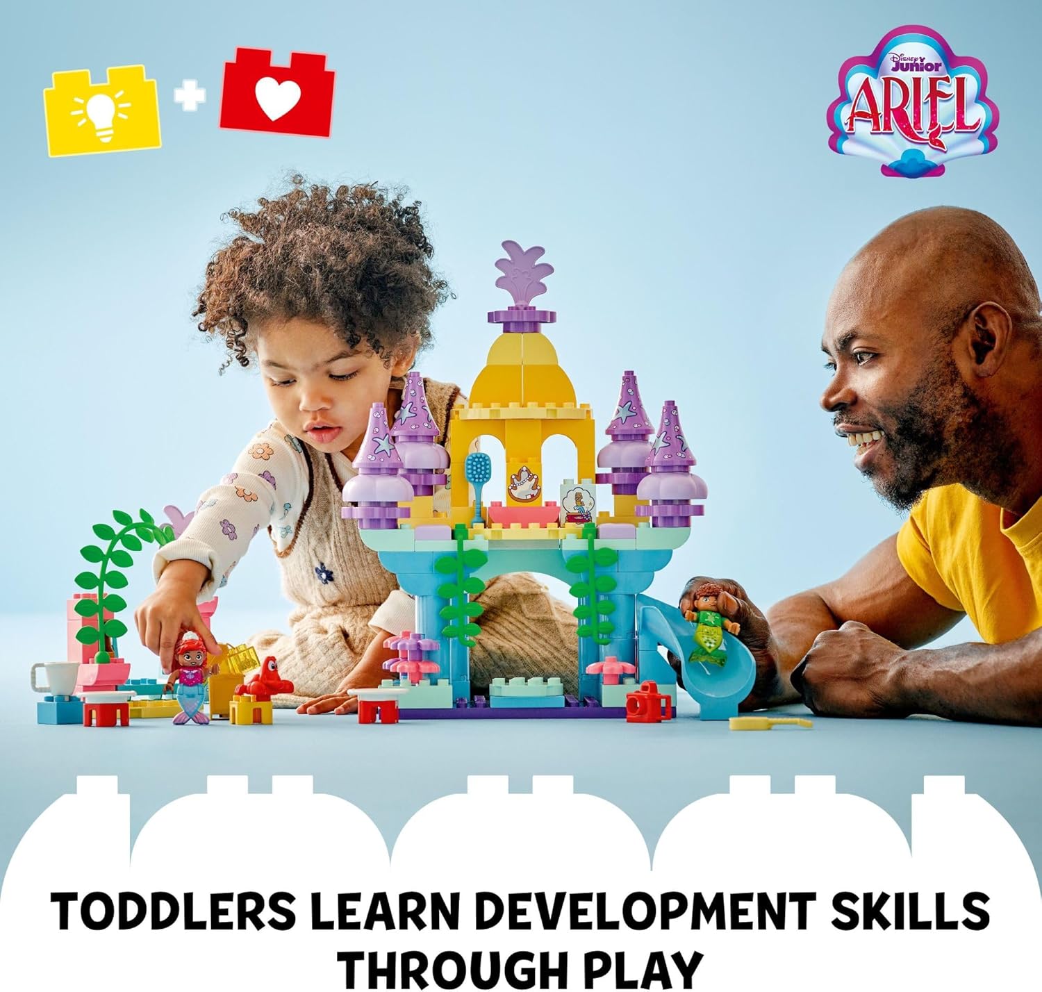 - Buildable toy castle home of Ariel, the Little Mermaid – Toddlers enjoy undersea construction fun with the LEGO DUPLO Disney Ariel’s Magical Underwater Palace.