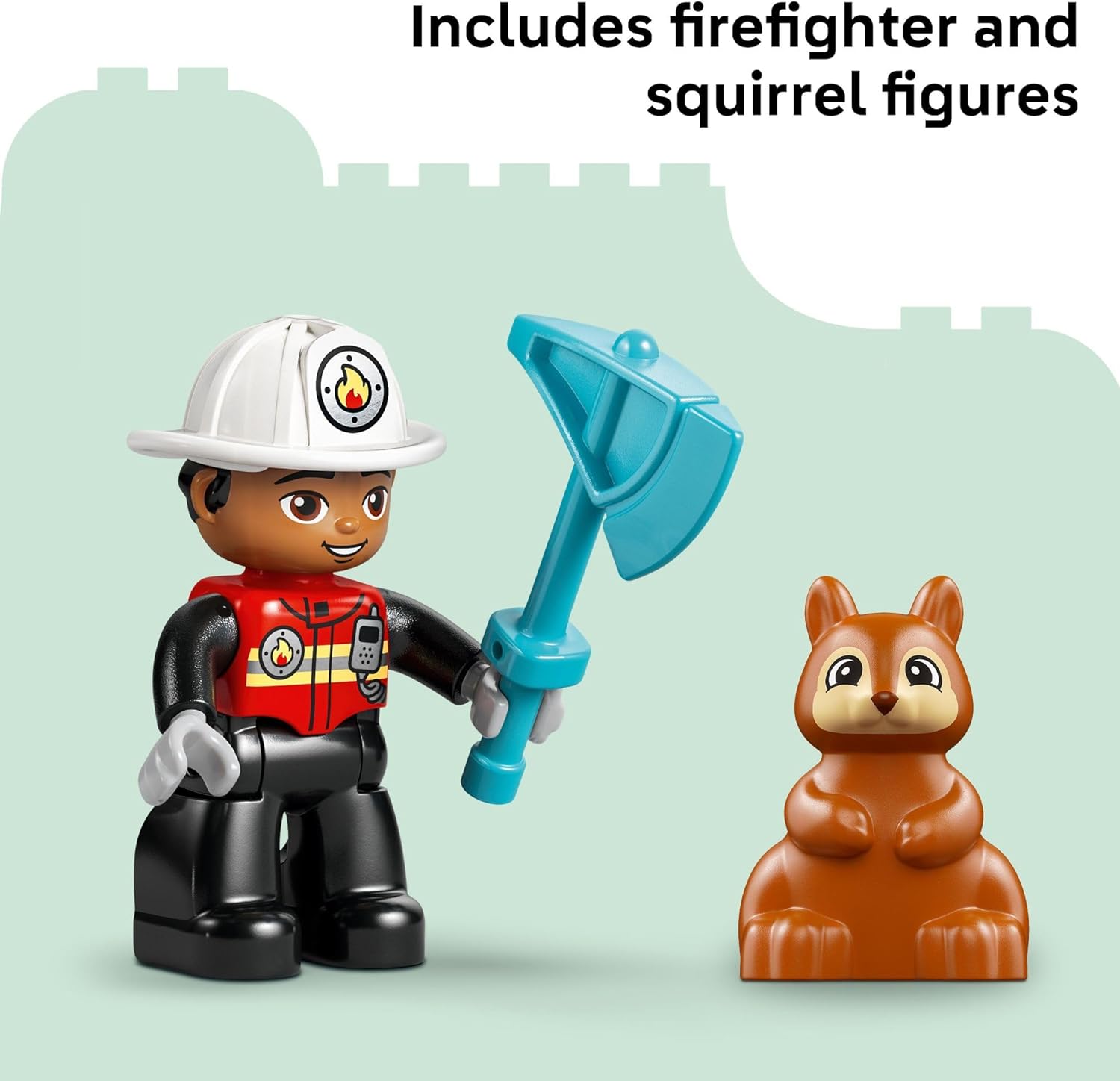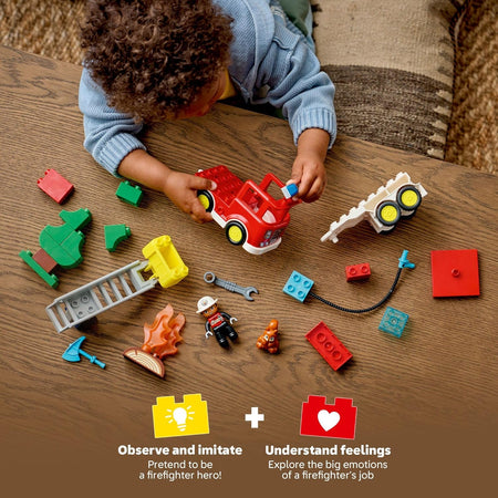 - ENCOURAGE CREATIVE PLAY – Includes a fire truck model with detachable trailer, a firefighter figure, LEGO DUPLO squirrel, and axe and wrench accessories to encourage imaginative save-the-day play