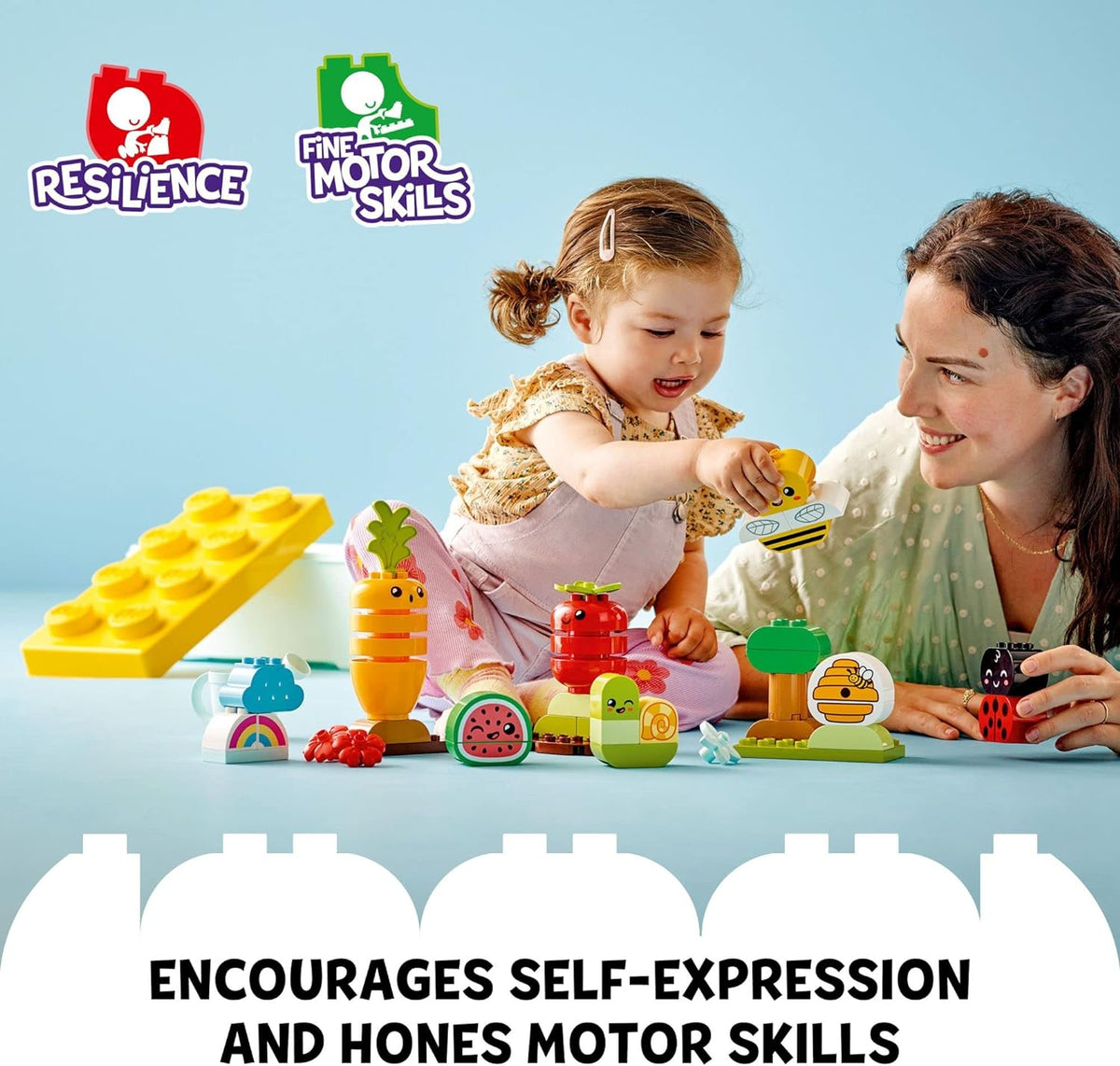 Immerse your little learner in nature with the LEGO DUPLO My First Organic Garden (10984) toy. Bring outdoors fun inside with this cool baby stacking toys set, full of brightly colored bricks and pieces. This educational toy for toddlers ages 1.5+ years old is packed full of features to help parents spark conversations about what grows in the garden and introduces kids to the idea of an ecosystem. There’s plenty for little fingers to explore, including Ladybug, bumblebee and caterpillar toys, plus tomato, carrot and watermelon fruit and vegetable toys, trees, flowers, wildlife and weather bricks. When playtime is over, everything packs away neatly into the LEGO DUPLO brick box. LEGO DUPLO My First sets offer limitless opportunities for imaginative, playful learning. This hands-on learning toy teaches toddlers how vegetables and fruits grow thanks to colorful stacking elements that help develop a toddler’s fine motor skills. The plants have cute faces to inspire kids’ self-expression and help them recognize diversity as they enjoy endless creative fun with this set of adorable food figures. Contains 43 pieces.