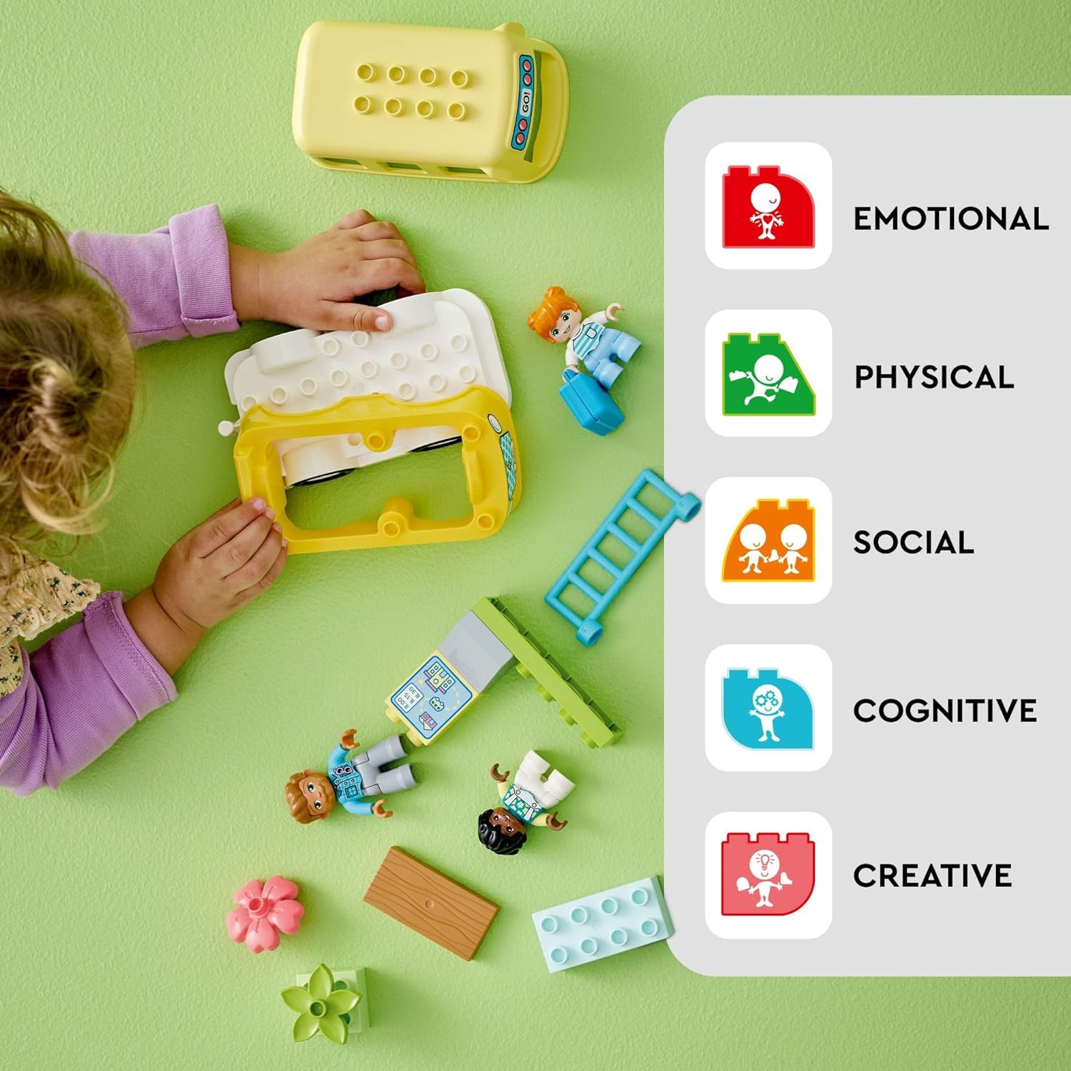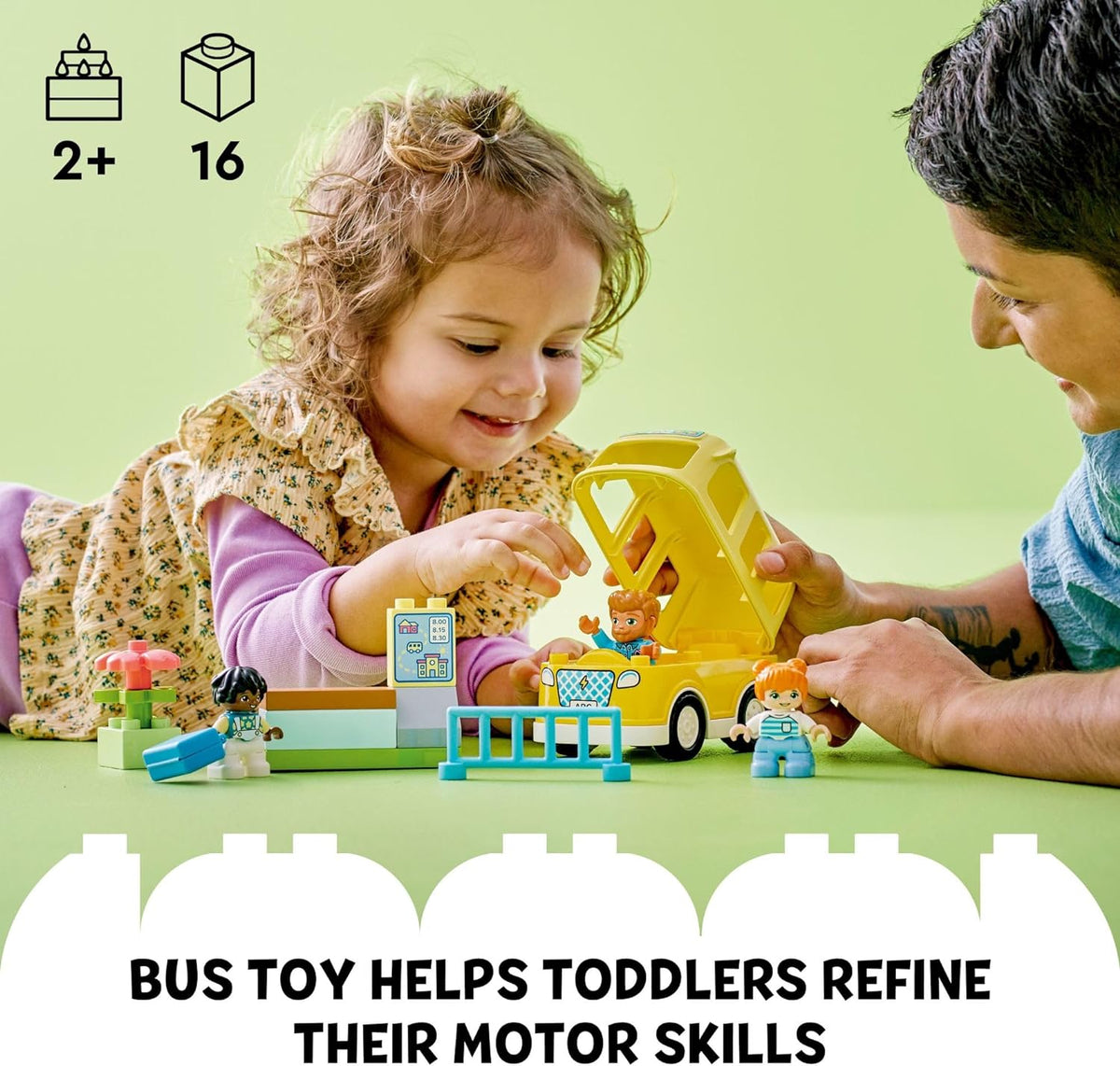 - Skill-building school bus toy set – Preschool boys and girls ages 2+ embark on an everyday adventure and learn fine motor and social skills as they hop aboard the LEGO DUPLO Town Bus Ride (10988) toy.