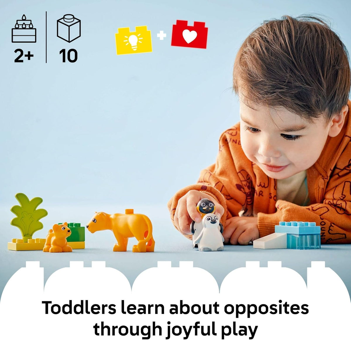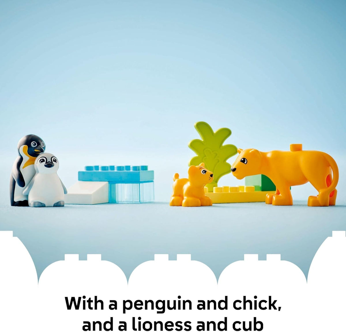 - ANIMAL TOYS AND FIGURES – This building set comes with 2 brick-built habitats and 4 LEGO DUPLO animal figures: a parent penguin and chick, and a lioness and her cub
