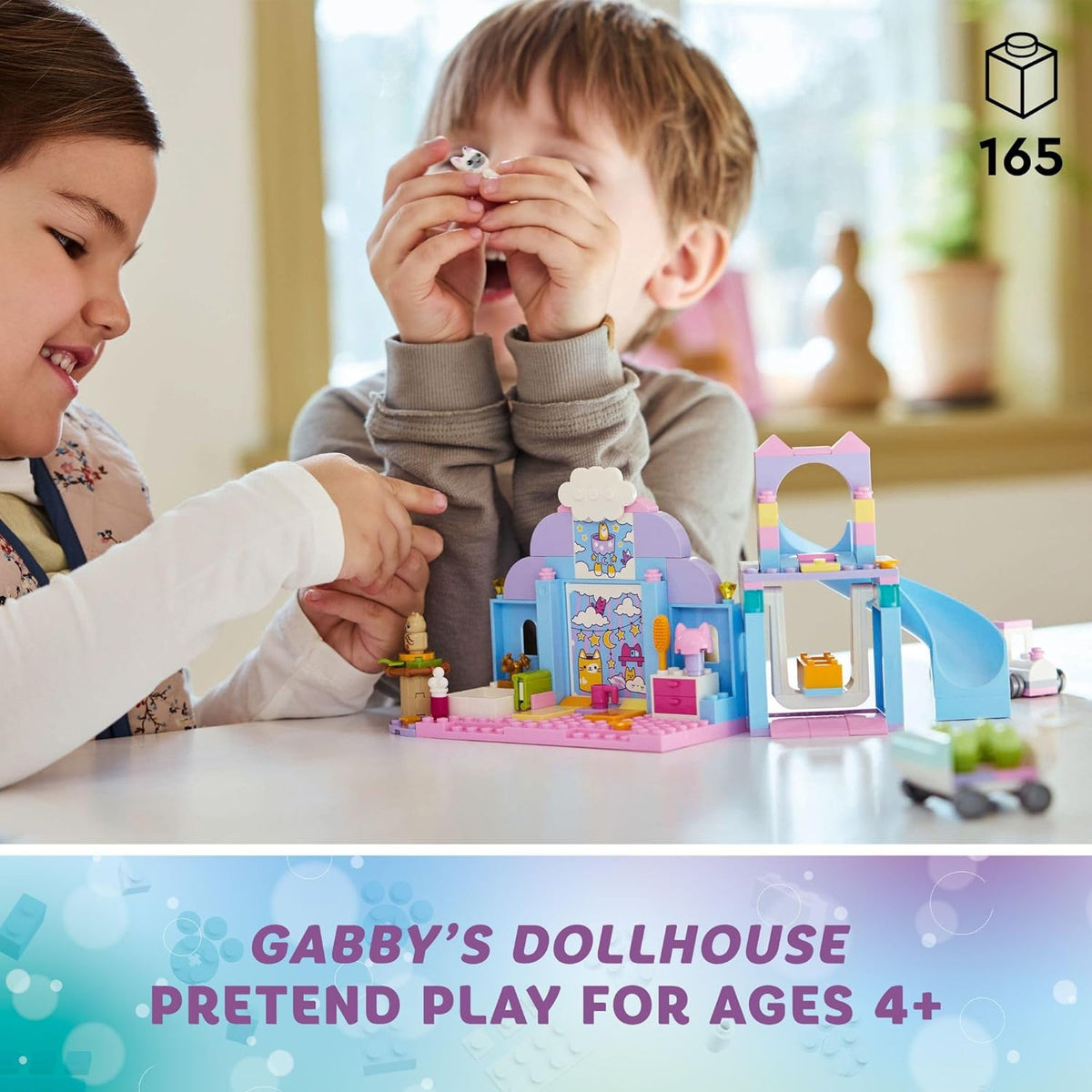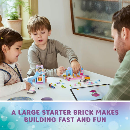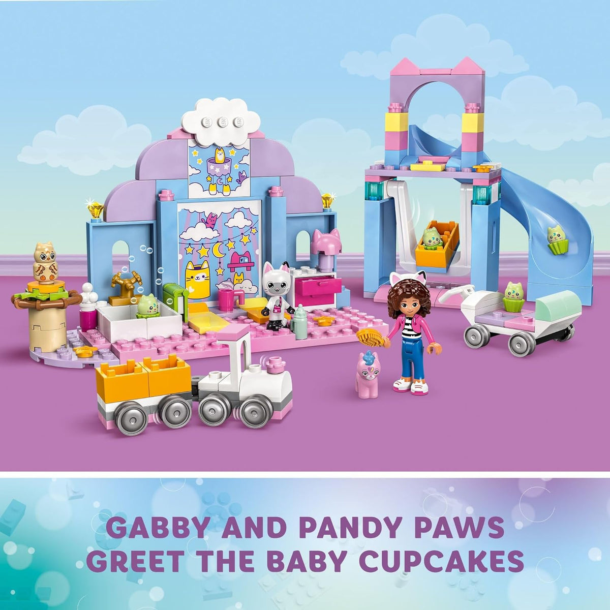 It includes a Gabby's Dollhouse doll, Pandy Paws, Baby Kittycorn, Baby Me-Owl and 4 Baby Cupcake figures. The playset comes with a pink car, swing, slide, toy train and a 4-seat cupcake tin stroller. There’s a bath with accessories, including shampoo and a hairbrush. A bottle, cup, storybook and a selection of cozy beds (including a nest for Baby Me-Owl) are included to ensure a relaxing naptime. The set comes with a Starter Brick to help kids get building underway. Intuitive instructions are provided in the form of a colorful picture-story guide. Contains 165 pieces.