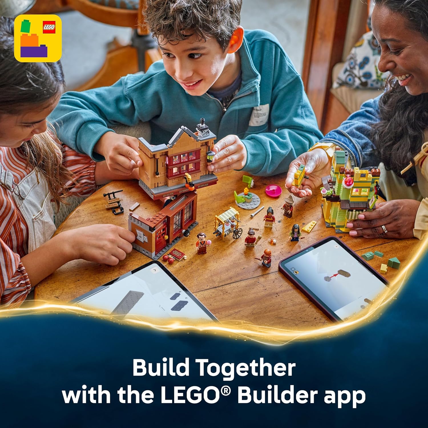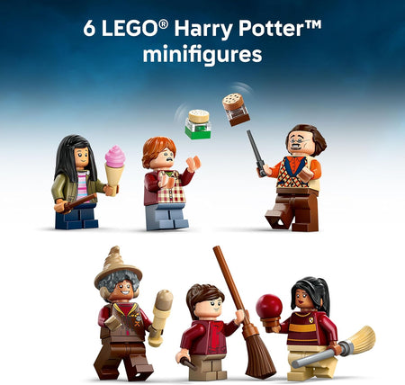 Tour the bustling streets of Diagon Alley with the LEGO Harry Potter Quality Quidditch Supplies & Ice Cream Parlour (76452) for kids, ages 8 years old and up. This building toy lets kids peek inside the wizarding world's most famous shopping district. Young witches and wizards can construct two iconic storefronts—Quality Quidditch Supplies with its magical floating broomstick display and Florean Fortescue's Ice Cream Parlour with indoor and outdoor seating areas. The set includes six detailed minifigures—Florean Fortescue, Katie Bell, Alicia Spinnet, Ron Weasley, Cho Chang, and a shopkeeper—perfect for creating pretend play adventures or plotting Quidditch strategies.