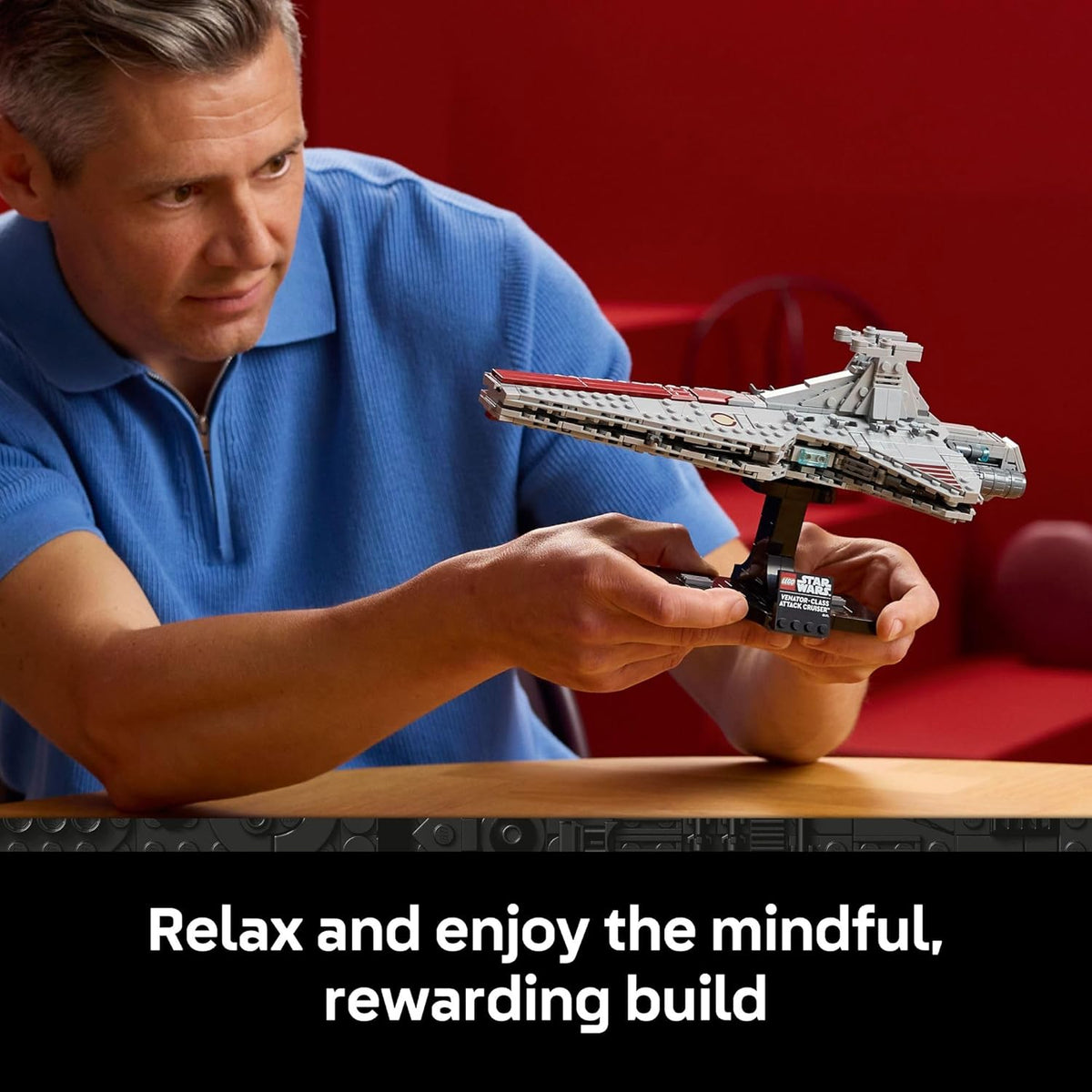 Recreate the Battle of Coruscant with the LEGO Star Wars Venator-Class Attack Cruiser (75441) building set for adults. This detailed model kit lets fans recreate the distinctive silhouette and authentic details of one of the most versatile starships in the Galactic Republic's fleet. Once their model is constructed, builders can display their creation on the included stand with a nameplate and lift off the top section to reveal the hangar bay, making an eye-catching addition to any home office, bedroom or bookshelf.