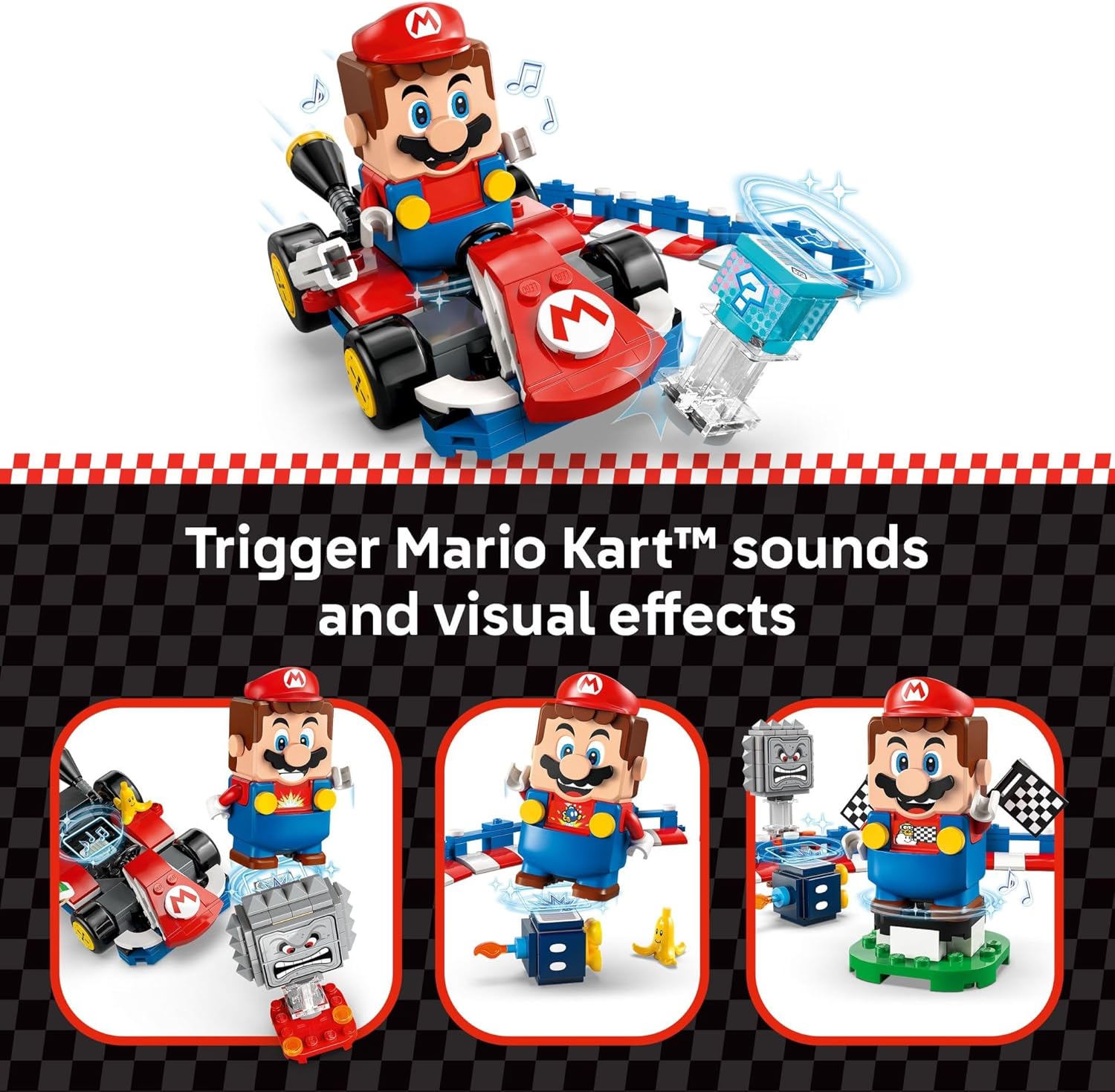 - INTERACTIVE RACING PLAY - Young builders can use the interactive LEGO Mario figure to earn digital rewards from the Item Box, defeat the Bob-omb and Thwomp figures, and trigger Mario Kart sound and visual effects by placing him in the Standard Kart