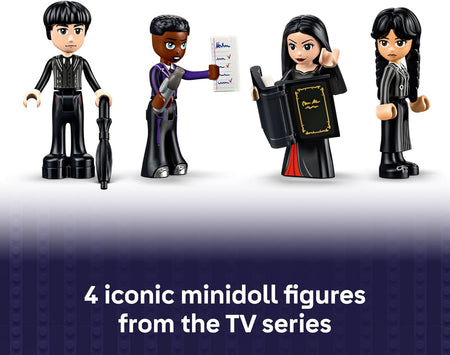 - 4 LEGO WEDNESDAY MINIDOLLS – Fans can use their Wednesday, Morticia, Bianca Barclay, and Lurch minidolls to explore the cottage, solve mysteries, or hop in the buildable family car for detective adventures around the Nevermore Academy campus