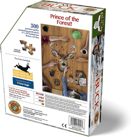 Prince of the Forest! Unique-shaped 300-piece jigsaw puzzle for ages 10 and up. Each puzzle comes with an educational Madd Capp Fun Facts booklet. On one side is a fold-out puzzle image to hang as a poster or use as a reference. On the flipside is a wealth of amazing facts. Did you know, for instance, that bucks can jump fences up to 9 feet high?
