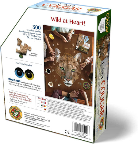 Wild at Heart! Unique-shaped 300-piece jigsaw puzzle for ages 10 and up. Each puzzle comes with an educational Madd Capp Fun Facts booklet. On one side is a fold-out puzzle image to hang as a poster or use as a reference. On the flipside is a wealth of amazing facts. Did you know, for instance, that cougars are born with blue eyes that turn to green and yellow as they age?