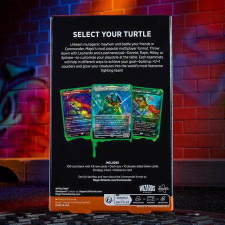 This Turtle Power! Magic: The Gathering | Teenage Mutant Ninja Turtles Commander Deck includes one 100-card deck with 43 new cards, deck box, 10 double-sided token cards, 1 strategy insert, 1 reference card
