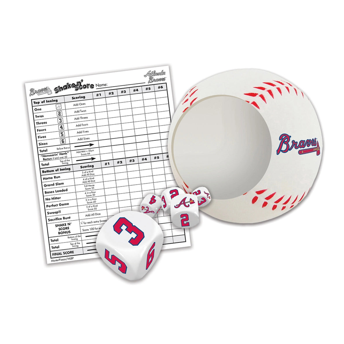 Introducing the Officially Licensed MLB Atlanta Braves Shake N' Score Dice Game! This MasterPieces Atlanta Braves Shake n' Score Dice Game is a collectible travel game for Atlanta Braves fans everywhere! It is perfect for tailgating or having fun at home with the family! Try to get as many points as possible by rolling different combinations of all five dice! The Shake n' Score Dice Game includes a team dice cup, 5 team dice, and an Atlanta Braves score pad! Two or more fans, ages 6+, can play this travel dice game!