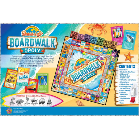 Walk along the boardwalk with Beach Life™ Boardwalk Opoly by MasterPieces! Play on a beach-themed game board featuring your favorite stops along the boardwalk and beyond. Learn fun facts about the beach along the way. Collect the most Beach Life™ boardwalk properties to win! This game comes with 6 Collectible Tokens, 22 Property Cards, 4 Wheel Fun Activity Cards, 2 Beach Gear Cards, 16 Greetings from the Beach Cards, 16 Scuba Diving Cards, money, 32 Beach Chairs, 12 Lifeguard Chairs, 2 dice, and game instructions. Life is better at the beach! For 2-6 players, ages 8+.