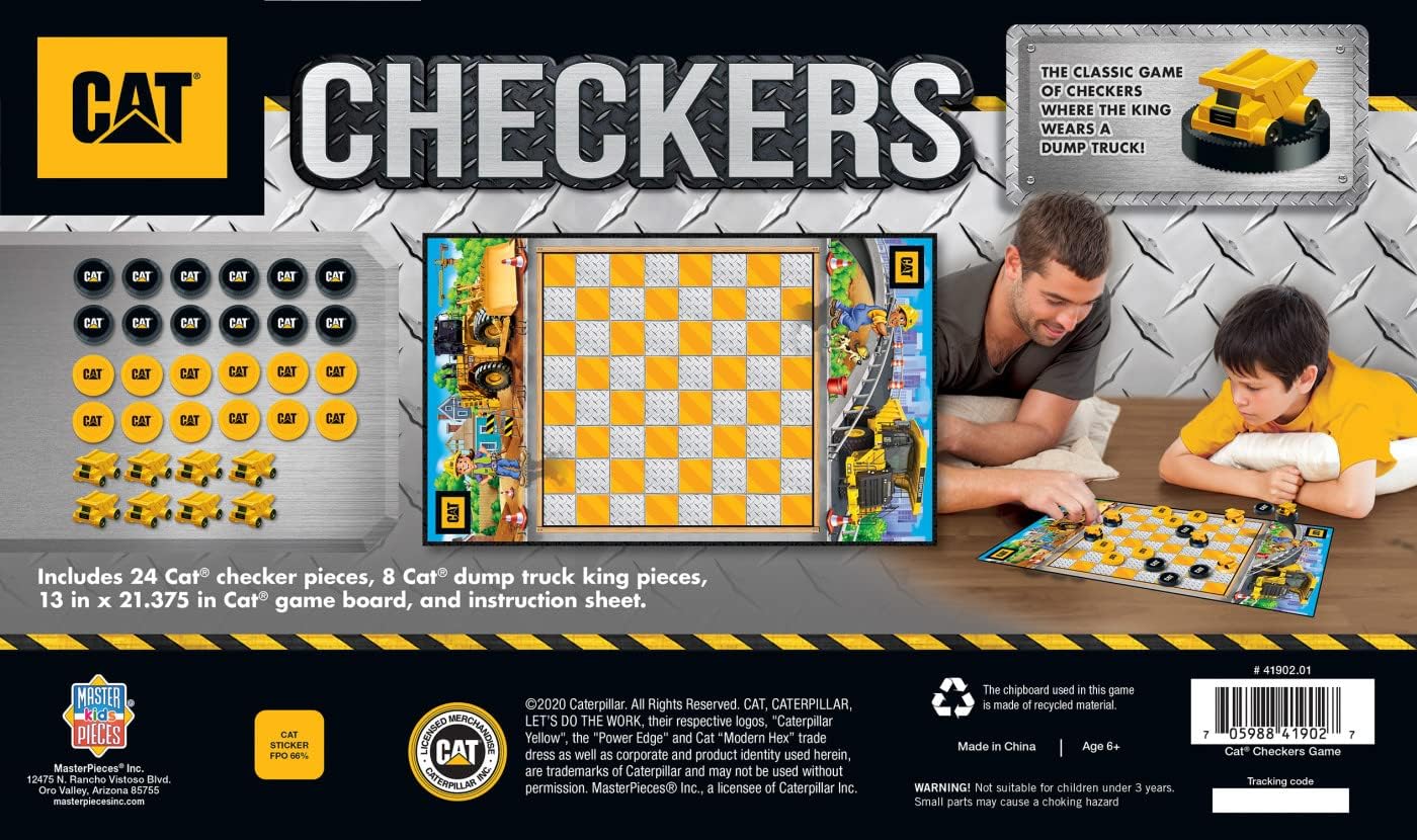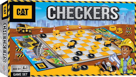 Introducing the CAT Construction Checkers Board Game - perfect for children and adults ages 6 and up! The classic game of checkers gets a construction-themed makeover, complete with CAT pieces and a dump truck king. This fun, family-friendly game includes 24 black and yellow CAT checkers pieces, 8 dump truck king pieces, a 13" x 21.375" CAT construction game board, 1 sticker sheet, and instructions. Whether you're playing with your kids or just winding down after a long day at work, the CAT Construction Checkers Board Game is sure to provide hours of entertainment. So roll up your sleeves and get ready to build some checkers skills! Requires 2 player.