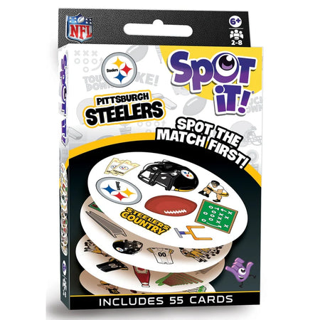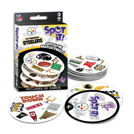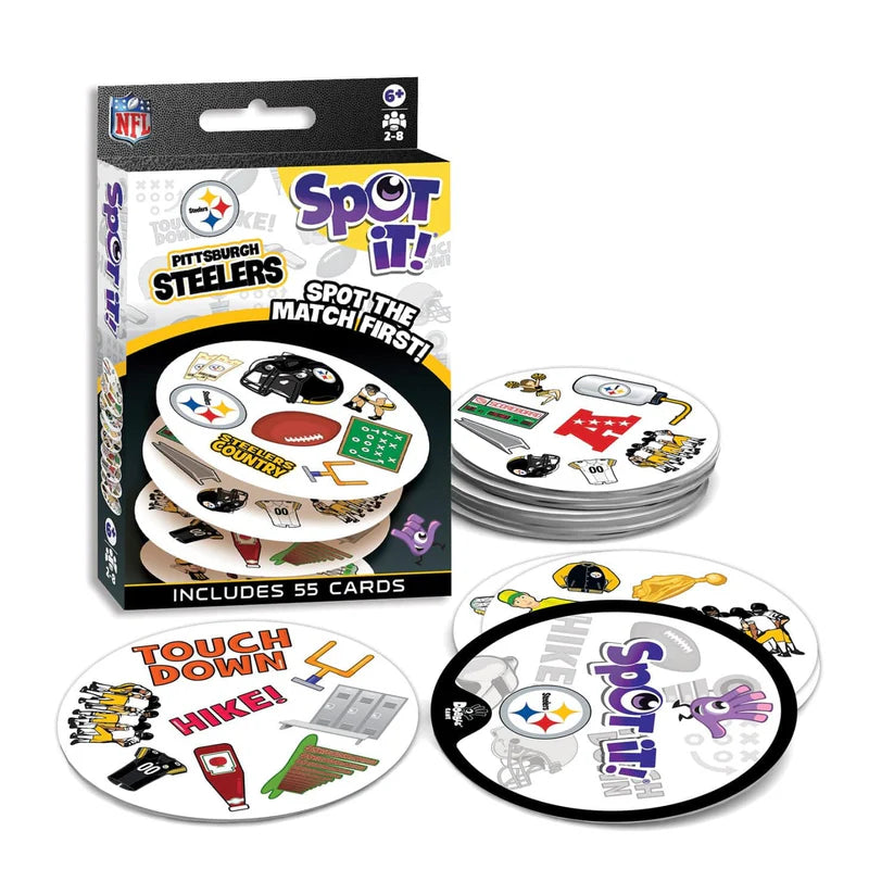 Spot It! Pittsburgh Steelers Edition puts a football spin on the family favorite. Just like the other Spot It! games, this NFL Pittsburgh Steelers Edition comes with a variety of unique symbols for you to identify and match from card to card. Many of the symbols represent Pittsburgh Steelers and the game of football. Play it once or play all night, with 55 unique cards and five different mini-games, you’ll catch yourself going into extra innings with Spot It! NFL Pittsburgh Steelers Edition.