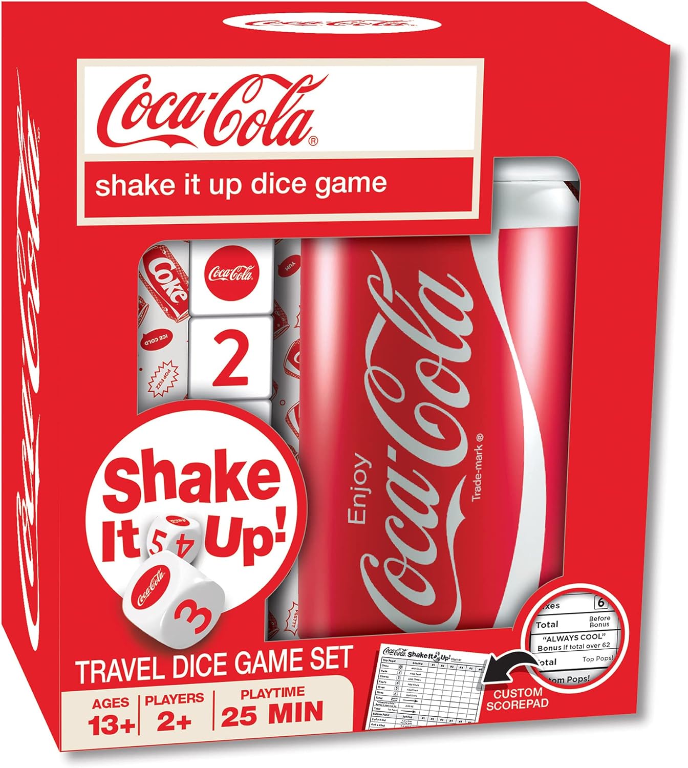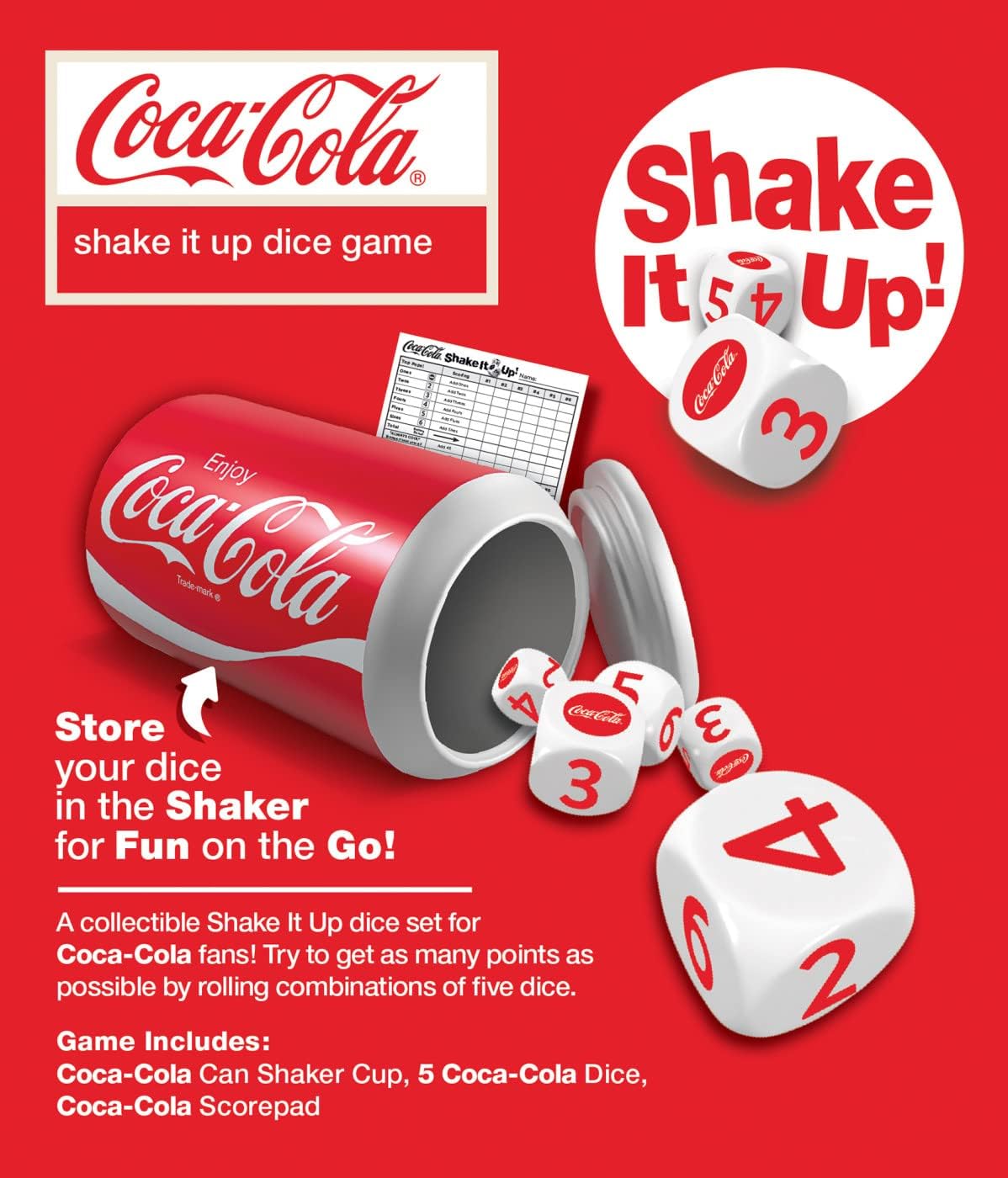 - Includes: a Coca-Cola Dice Cup, 5 Coca-Cola Dice & a Custom Coca-Cola Score Pad