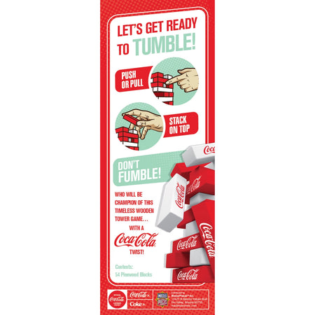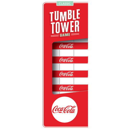 This Coca-Cola Tumble Tower is a classic game for fans of the iconic beverage. The game features 54 wooden blocks adorned with the iconic Coca-Cola colors and logo. The object of the game is to be the last player to stack a block without causing the tower to tumble. The higher the tower grows, the harder the challenge! This game can be played by one or more players. It's the perfect way to bring friends and family together for some classic fun and competition. Plus, it helps build hand-eye coordination and problem-solving skills. So get ready to stack up the challenge with Coca-Cola Tumble Tower! For your next game night, add a timeless classic that stands tall — Coca-Cola Tumble Tower! Enjoy the challenge and cheers to your victory! Officially licensed Coca-Cola product.