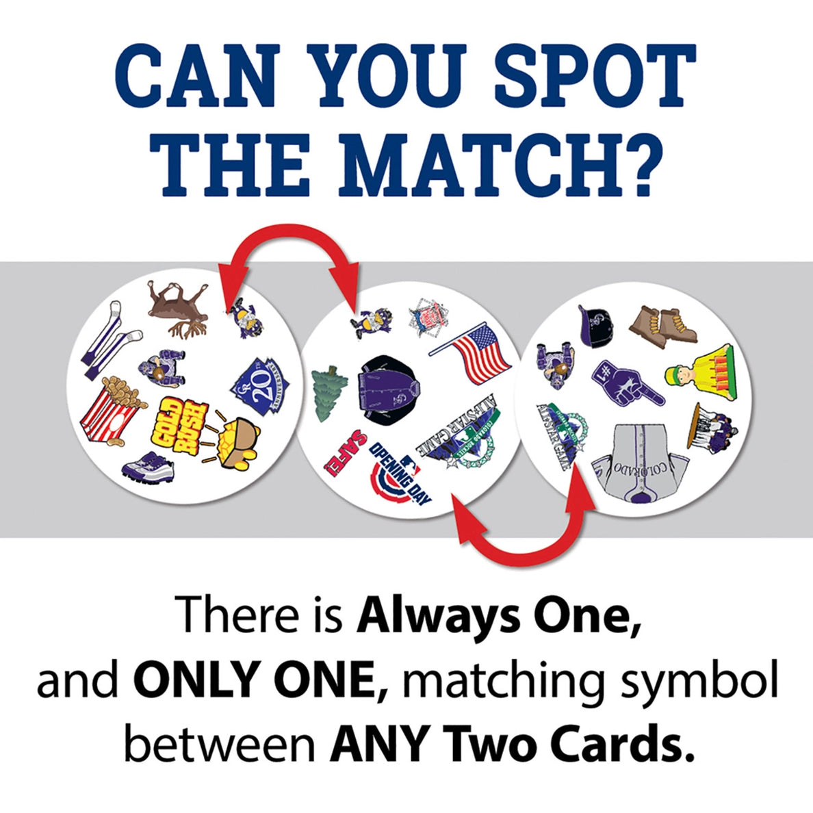Spot It! Officially licensed MLB Colorado Rockies Edition puts an exciting spin on the family favorite. Just like the other Spot It! games, this Colorado Rockies Edition comes with a variety of unique symbols for you to identify and match from card to card. Many of the symbols represent the Colorado Rockies and the league. Play it once or play all night, with 55 unique cards and five different mini-games, you'll catch yourself going into extra innings with Spot It! Colorado Rockies Edition. Games take approximately 5 to 10 min to complete and is perfect for children and adults ages 7 and up.