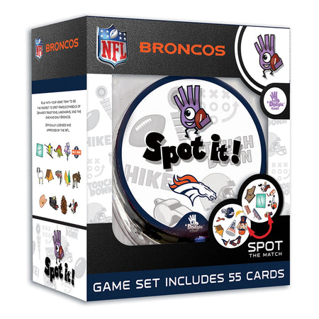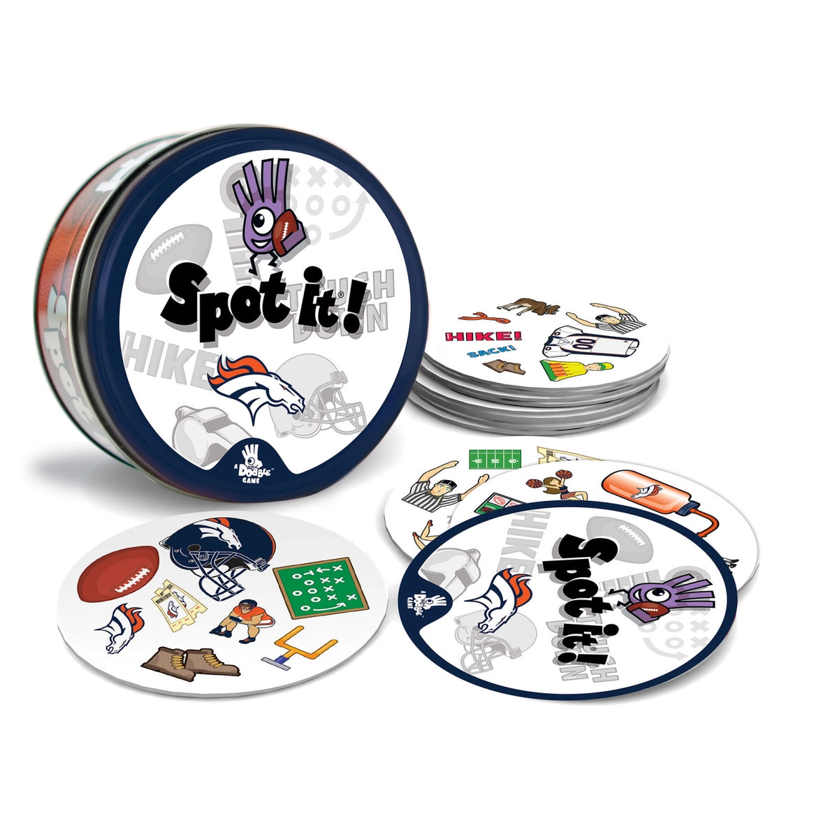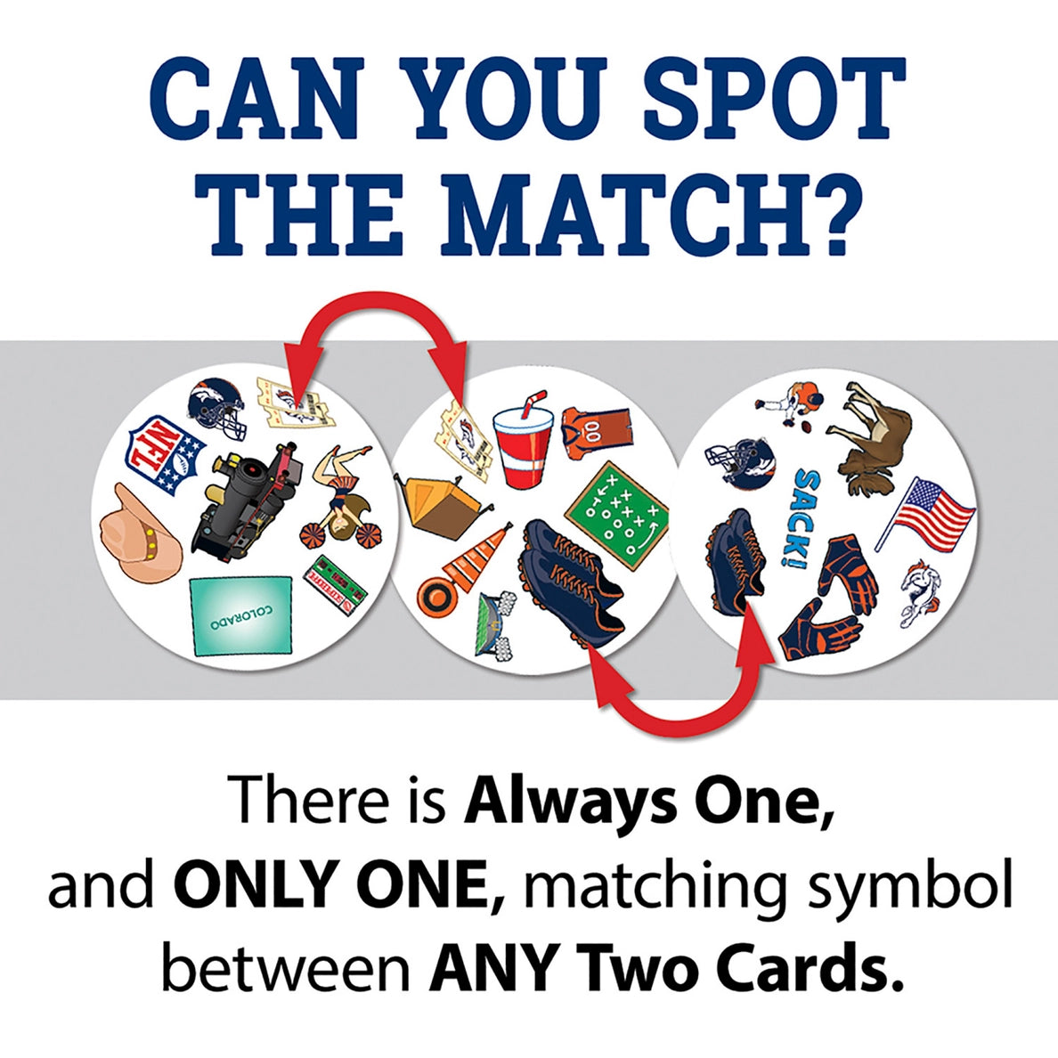 Spot It! Officially licensed NFL Denver Broncos Edition puts an exciting spin on the family favorite. Just like the other Spot It! games, this Denver Broncos Edition comes with a variety of unique symbols for you to identify and match from card to card. Many of the symbols represent the Denver Broncos and the league. Play it once or play all night, with 55 unique cards and five different mini-games, you'll catch yourself going into extra innings with Spot It! Denver Broncos Edition. Games take approximately 5 to 10 min to complete and is perfect for children and adults ages 7 and up.