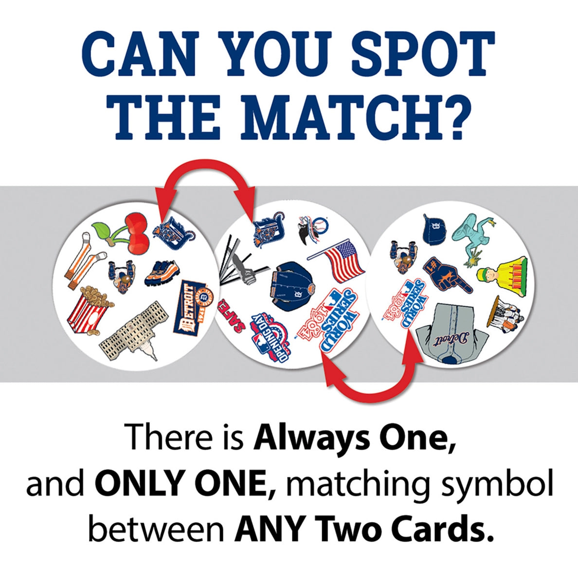 Spot It! Officially licensed MLB Detroit Tigers Edition puts an exciting spin on the family favorite. Just like the other Spot It! games, this Detroit Tigers Edition comes with a variety of unique symbols for you to identify and match from card to card. Many of the symbols represent the Detroit Tigers and the league. Play it once or play all night, with 55 unique cards and five different mini-games, you'll catch yourself going into extra innings with Spot It! Detroit Tigers Edition. Games take approximately 5 to 10 min to complete and is perfect for children and adults ages 7 and up.