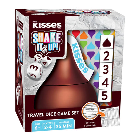 This MasterPieces Hershey's Kisses Shake it Up! Dice Game is a collectible travel dice game for chocolate fans! This sweet-rolling dice game is perfect for having chocolatey fun at home with the family. Try to get as many points as possible by rolling different combinations of all five dice. The Shake it Up! Dice Game includes a Hershey's Kisses dice cup, 5 Hershey's Kisses dice, and a Hershey's Kisses score pad! Two or more chocolate fans, ages 6+, can play this travel dice game!